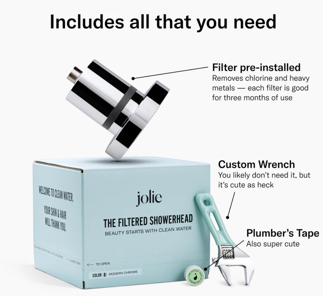 Jolie shower filter removes chlorine and heavy metals, helping reduce dryness, irritation, and hair shedding—your essential first step for healthier skin and hair.
